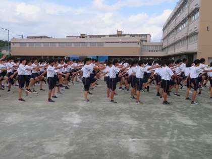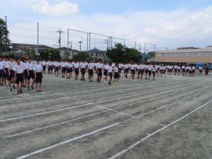 2年生の行進練習の様子です。前回に比べ、腕や足が上がり、全体もそろってきました。この調子で頑張りましょう。(田村)