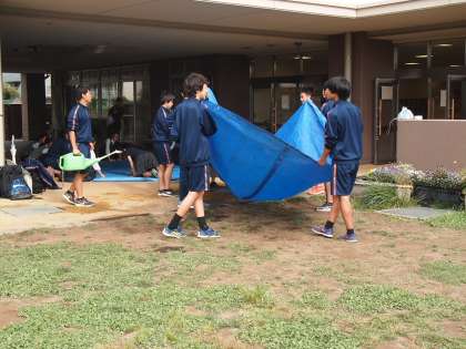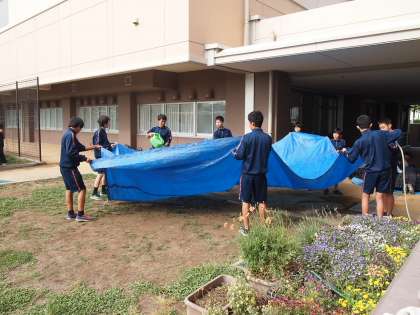 昨日大会があった陸上競技部の生徒が、いつもより少し早く登校し、テントを丁寧に洗って干しています。ここにも、何事にも真摯にむきあうフナキボ生の心いきが感じられますね。