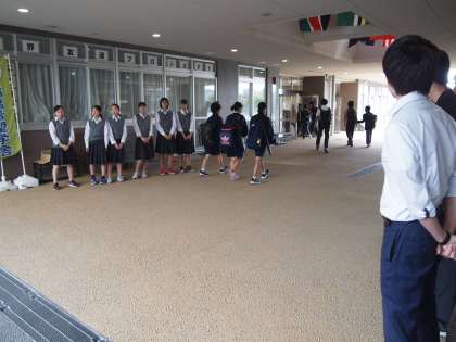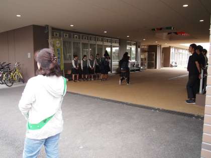 今年度初の3年6組保護者の見守り「あいさつ運動」には、3年6組の生徒も参加しています。見守られるだけでなく、自分たちも見守る方に参加して意識を高めます。