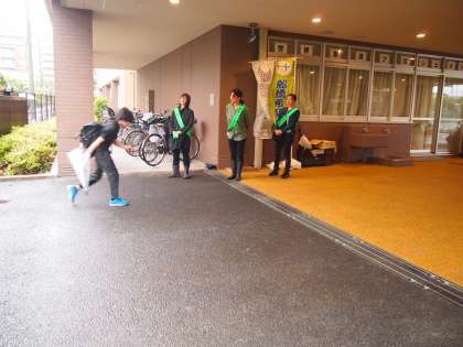 今朝の天候は、傘が壊れた生徒も多数いたほどの暴風雨です。その中でも、3年6組の保護者の方が見守り「あいさつ運動」に参加してくださいました。