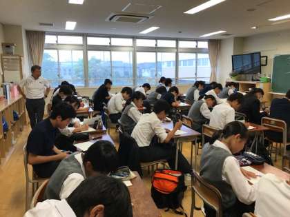 3年生の国語の授業です。中間考査の返却がありました。結果はもちろん大切ですが、なぜ点が伸びなかったのか、何が足りなかったのかを振り返って反省し、次にいかすように、先生が丁寧に指導しています。(副校長)