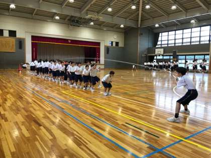 1年生の保健体育の授業です。運動会の団体競技の練習をしています。生徒たちが声を掛け合いながら、跳ぶ回数が増えるように、試行錯誤しながら取り組んでいます。(副校長)