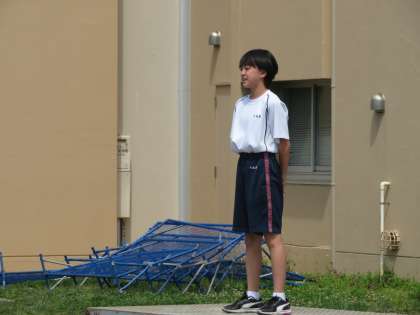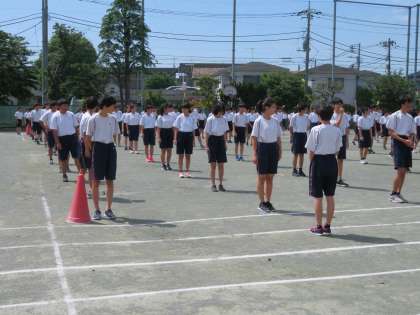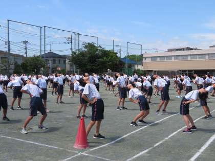 2年生の学年練習も3回目になりました。ラジオ体操では、細部にも意識をはたらかせ一生懸命頑張っています。(田村)