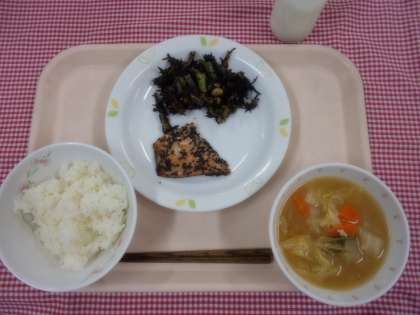 副菜の「ひじきの煮つけ」のひじきは、鉄分やカルシウム、マグネシウムなどのミネラルが豊富に入っています。成長期のフナキボ生の体をつくるために大切な栄養なので、残さず食べてくださいね。