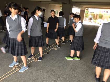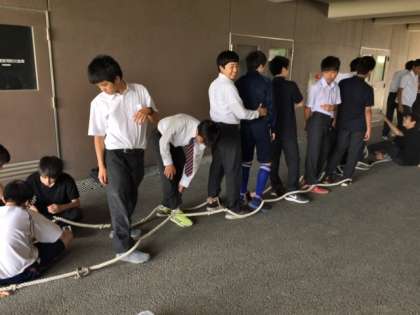 放課後、3年生がムカデ競走で使うロープの調整をしています。本番で良い結果を残すため、万全の準備を行います。(大居)