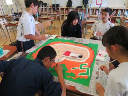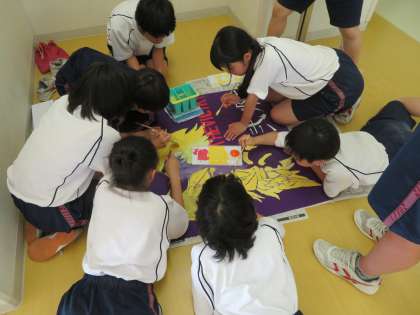 2年生のクラス旗作成の様子です。どのクラスも完成が見えてきました。(田村)