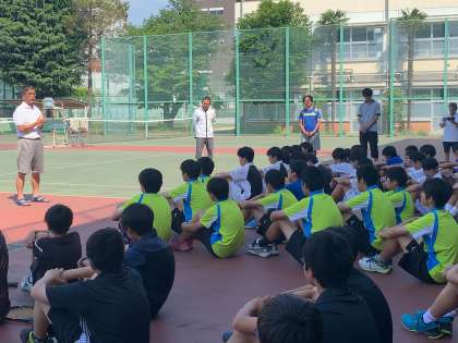 硬式テニス部男子は、10人で三宿中学校に練習試合に来ました。4校での団体戦なので、3勝できるように頑張っています。 増子