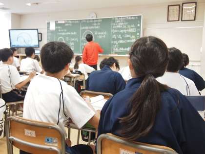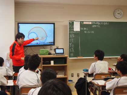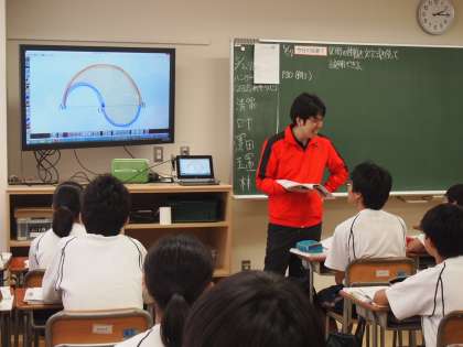 2年生の数学は、図形の性質を文字を使ってあらわす勉強をしています。教科書の図を使いますが、黒板に写すとそれだけで時間がかかります。そこでデジタル教科書の登場です。図にマーカーで色を付けることもできますし、それを一瞬で消すこともOK。わかりやすい授業に貢献しています。