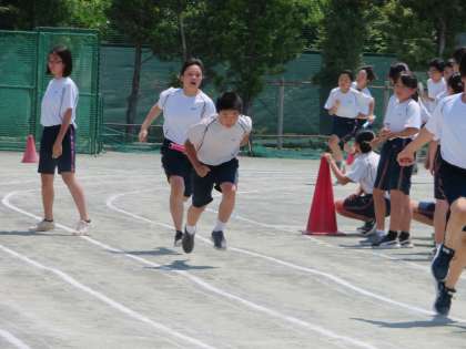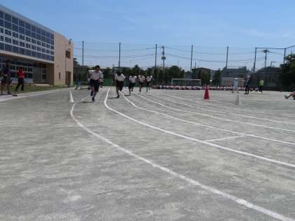2年生学年練習、全員リレーの様子です。本番に向け、気持ちの入ったバトンパスが続いています。(田村)