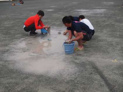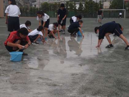 今日は、運動会予行の日。明け方まで降っていた雨があがり、校庭には何カ所か大きな水溜まりがありますが、その他のちょうど良い状態です。そこで、体育委員や朝練習に来た部活動生徒そして先生も加わり早朝から「水溜まり撤去大作戦」が決行されました。雑巾で吸い取ってはバケツへ、吸い取ってはバケツの繰り返し。