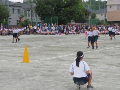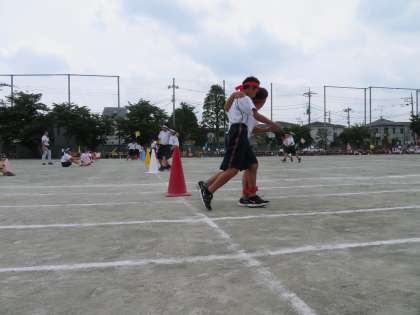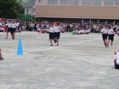 二人三脚の様子です。2人で息を合わせてそれぞれのペアが頑張っています。フナキボレコードも更新され、あらたな歴史が刻まれました。(田村)