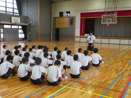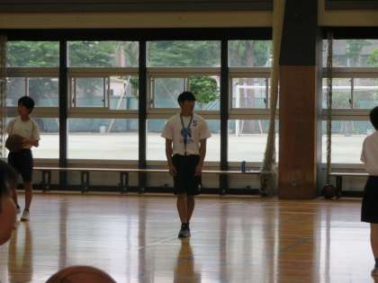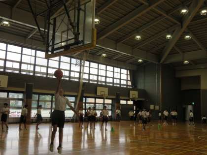 教育実習生による体育の研究授業の様子です。バスケットボールのシュート練習の場面では、生徒たちへあたたかい声かけがいくつかありました。