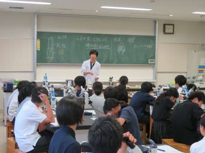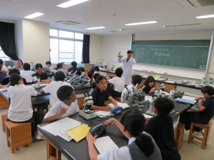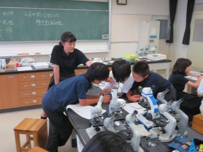 1年生、渡邊是能先生の研究授業の様子です。植物のつくりを実際に双眼顕微鏡を使って調べ、考察する授業でしたが、生徒たちがとてもいきいきと授業に取り組んでいました。10期生の学びに対する積極性が感じられました。(田村)