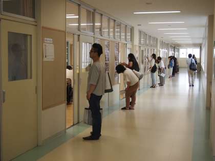 1年生の廊下には多数の保護者の方がいて熱心に見ています。授業を…いえ、実は移動教室で写真屋さんが撮影した写真を廊下に掲示していて、我が子の画像を熱心に探している姿でした。親心、分かります。