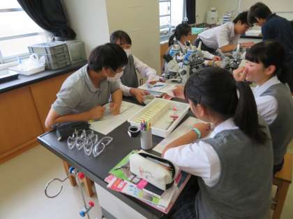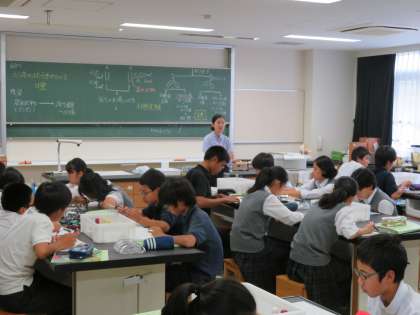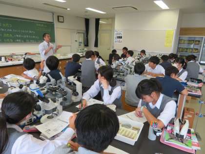 2年生理科の授業の様子です。生物分野、化学分野ともに理科室で実験を行っています。