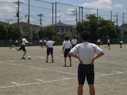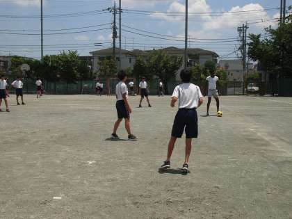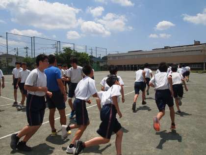 2年生の体育は青空のもとサッカーとバレーボールをしています。サッカーの前にはランニングでウォーミングアップをします。