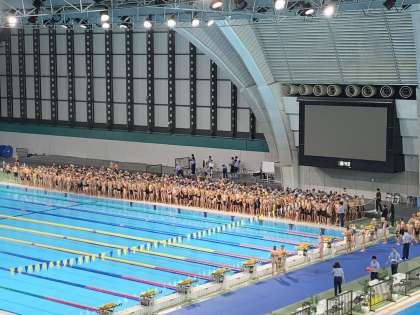 辰巳国際水泳場での大会、2日目が始まります。 今日もベストを尽くして頑張れ!(丸本)