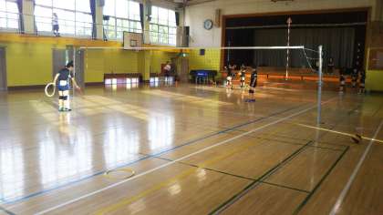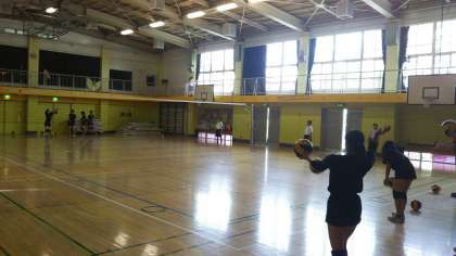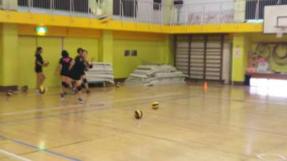 バレーボール部の活動の様子です。本校の体育館は空調設備の工事のため、千歳台小学校の体育館をお借りしています。地域の協力に感謝の気持ちをもって練習に取り組みましょう。(田村)