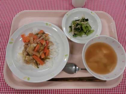 そこで今日は「豚肉のしょうが炒め丼」が主食の献立です。