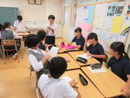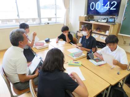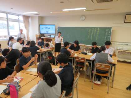 末松先生の2年次研修研究授業の様子です。1年生のスピーチの授業で、自分たちのスピーチを相互に評価しながら、良かった点や改善点を出し合っています。ICTの活用や話し合い活動など、内容を工夫して行っています。