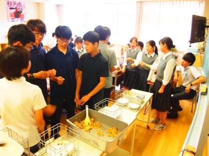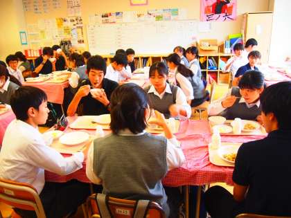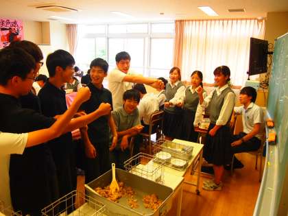 今日の一番人気はデザートの果物。残りわずかになったパインアップルを求めて、じゃんけんで決着をつけます。みんな楽しそう。