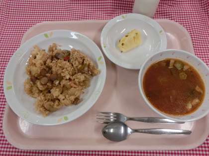 今日の給食では、アメリカ南部のケイジャン料理であるジャンバラヤと、ガンボというオクラの入ったスープを出しました。ドミニカ国でもよく食べられている料理だそうです。