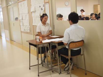 3年英語では、1対1のspeakingテストを実施。あらかじめ知らされている10のテーマの中から、くじ引きで当てた番号のお題について2分間の会話をします。最初は緊張、でも話をしているうちに笑顔が。