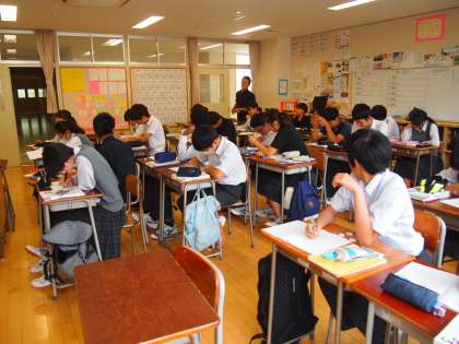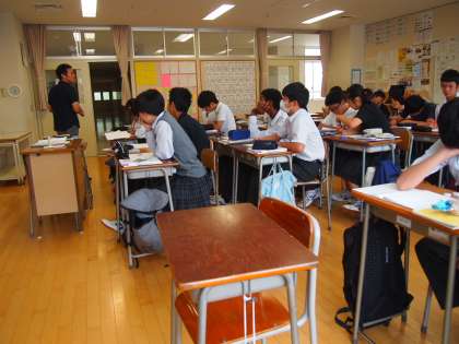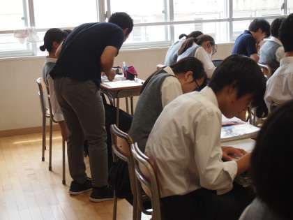 2次関数の学習を少人数で行っています。数学担当の先生がヒントを出して、分かった人は手を上げています。その場にそっと歩み寄り「そう、正解!」と言うと、他の生徒は「え〜、なんでだろ〜?」と少し焦り?刺激を受けた様子です。そしてまた自分のノートに向き合っていました。