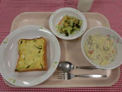 「たまごトースト」は、ゆで卵ときゅうりをマヨネーズで和えた卵サラダを食パンにのせ、チーズをかけてトーストしました。意外な組み合わせかもしれませんが、おいしいですよ。