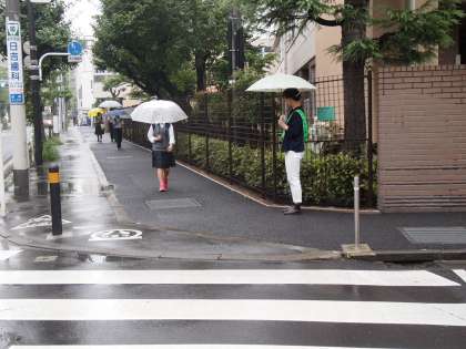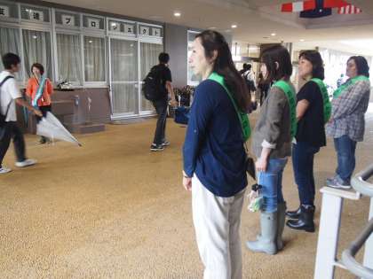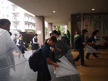 瑞雨の中のあいさつ運動