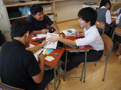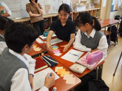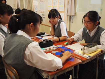 2年数学、1次関数の学習です。折り紙を題材に考えた結果を4人グル-プで共有します。いかに自分の考え方を、みんなに分かるように説明できるか。普段のおしゃべりとはまったく異なるコミュニケーション力が求められます。