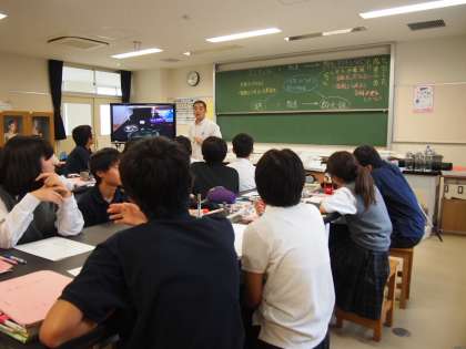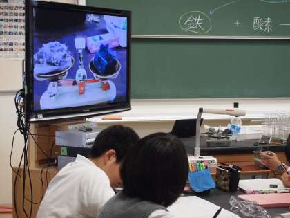 2年生理科の授業は、化学変化と原子・分子の単元を勉強中です。今日は、有機物を燃やした後の様々な変化を学習します。まずは、先生の実験をモニターで観察です。
