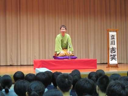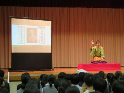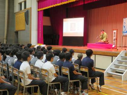 本日1校時、2年生は落語鑑賞と海の環境について考える「海の親子寄席〜出前授業〜」の取り組みを体育館で行いました。前半は落語鑑賞を行い、日本の古典落語に触れる貴重な経験でした。(田村)
