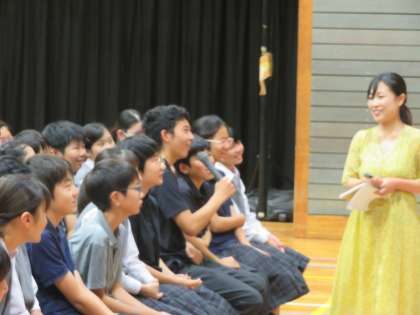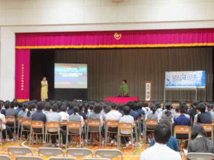 2年生出前授業の後半です。後半は海の環境についての説明がありました。生徒たちも興味・関心をもって話しを聴いていました。(田村)