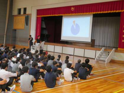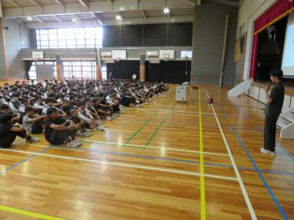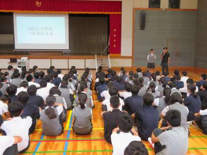 2年生の学年集会の様子です。各クラスの学級委員から、クラスの反省と1学期の振り返りのアンケート結果についての話がありました。