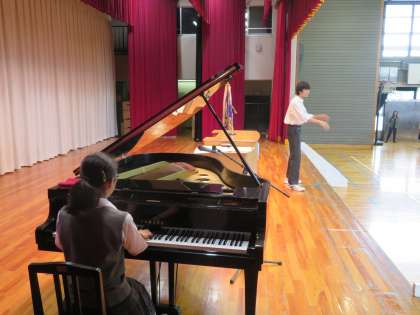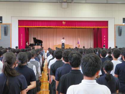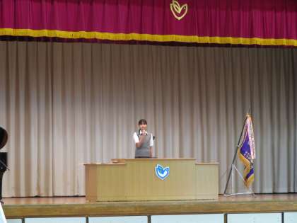 校長先生のお話に続き、校歌斉唱と生徒会からのお話しがありました。生徒会からは初休みの過ごし方についてのお話しがあり、生徒たちも真剣に聞いていました。(田村)