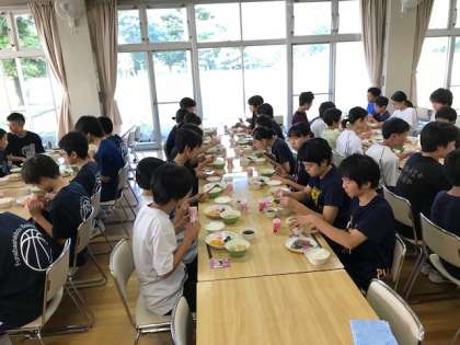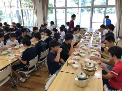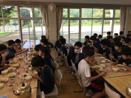朝食の時間です。たくさん食べて練習に備えます。(副校長)