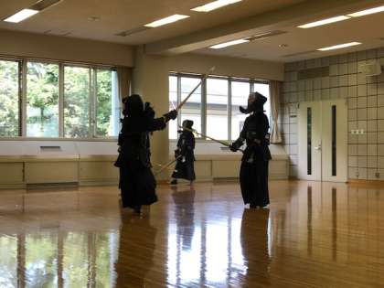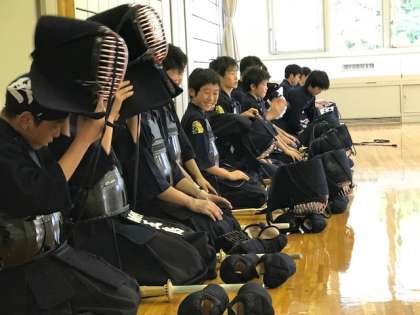 昼食を食べて、午後の練習が始まりました。剣道部は、面をつけてのかかり稽古に汗を流しています。(副校長)