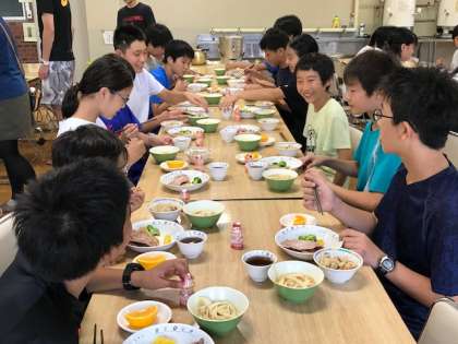 食事係の準備が早かったので、予定より早く夕食の時間となりました。今日もみんなたっぷり食べています。(副校長)