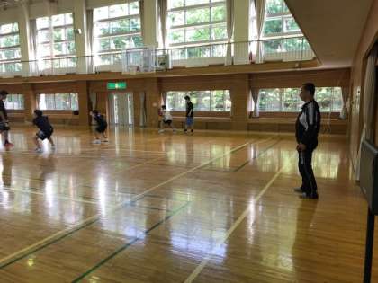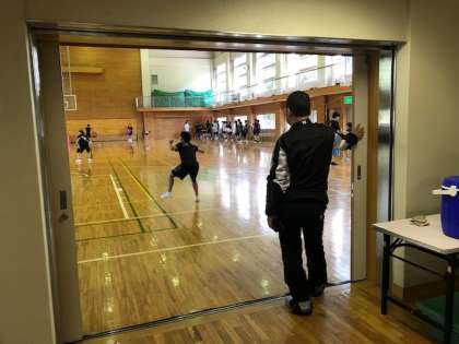 体育館を見つめる、この後ろ姿。見覚えのある姿、そう、校長先生が学園に応援に来ました。(副校長)