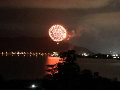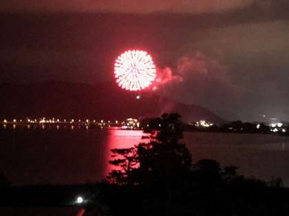 練習途中ですが、河口湖の花火が上がるというので、みんなで楽しみました。とてもきれいでした。(副校長)