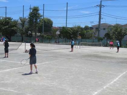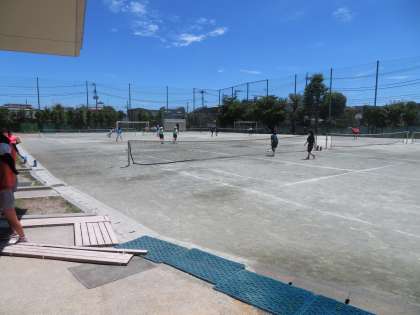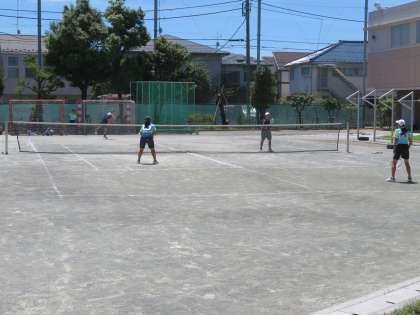ソフトテニス部の練習試合の様子です。気温も高くなっていますが、試合にも熱心に取り組んでいます。熱中症には十分注意し、水分補給も忘れずに行いましょう。(田村)