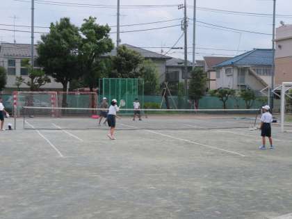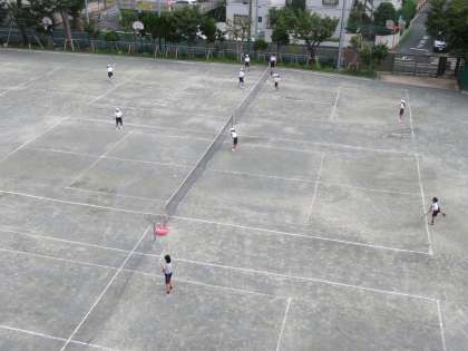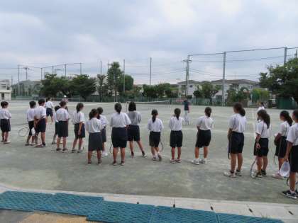 ソフトテニス部の練習の様子です。顧問の市川先生からダブルスの前衛と後衛の位置関係についての指導がありました。生徒たちも実際にダブルスの中で声を出して自分たちの位置を確認しながらプレーしていました。(田村)