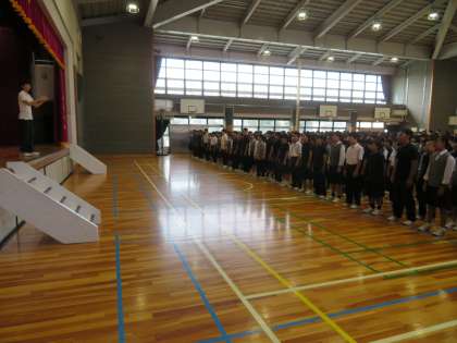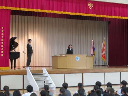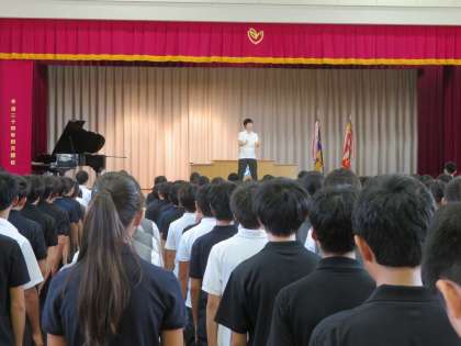 また、校歌斉唱の後は教育実習生のあいさつがありました。9月からは1年生の理科、そして養護の実習生の2名が本校で頑張ります。(田村)