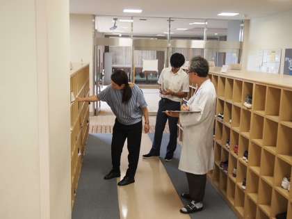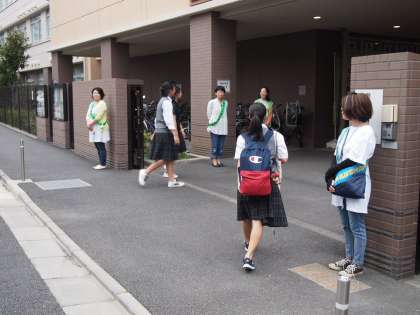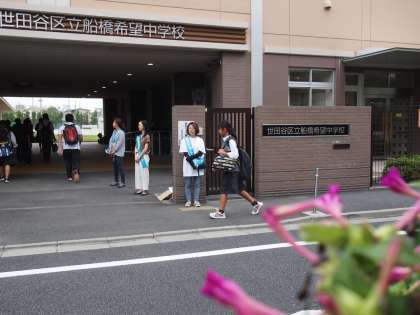 フナギホ生が小学校にあいさつキャンペーンに出かけているちょうどその頃、中学校では1年1組の保護者の方を中心にあいさつ運動が行われ、校門や希望丘通りの角に立って、見守りと声かけをしていただいています。そして、始業のチャイムが鳴ると同時に、副担任の下駄箱での出席確認が始まります。特に、長期休業明けの2学期始めは、心に不安を抱えていたり、生活リズムが崩れて登校しづらい生徒も出始める頃です。地域、保護者の声かけと、担任、副担任の連携でフナキボ生を支えています。