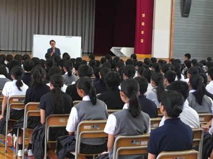 一年生は9月中、「いじめ防止プログラム」を行います。今日は、第一回の全体講話を受講しました。全員、真剣に話を聞いていました。