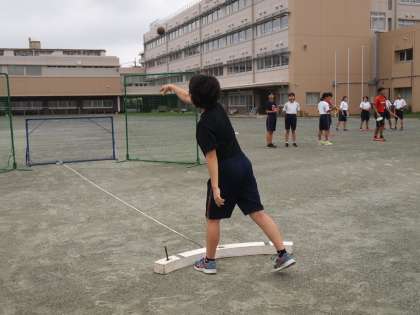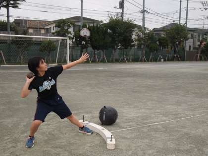 砲丸投げの練習に取り組んでいます。この競技は特に無理のない美しいフォームが飛距離を伸ばすのに欠かせません。構えから‘美しさ’が際立ちます。