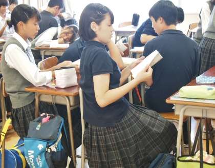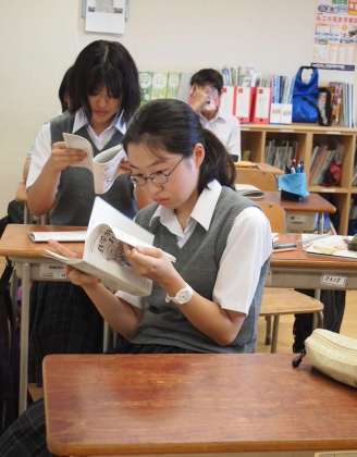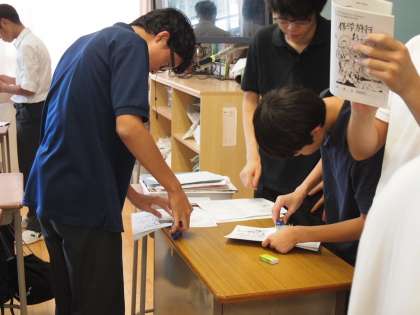 修学旅行の気分を盛り上げるものの一つに「しおり」があります。今回、8期生がもっていくしおりは全部で40ページになります。一生懸命綴じ込んで作ったしおりを、すぐに目を通しています。気になるページはどこでしょうか。