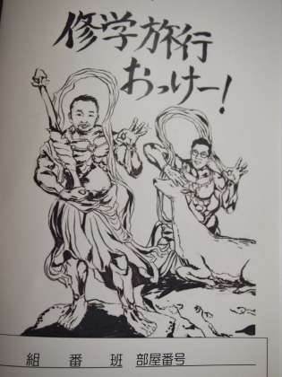 そして毎年、修学旅行の表と裏の表紙絵を飾るのは、生徒の作品です。今年も、表と裏の絵のコントラストが見事です。んっ?表紙を飾る像は、どこかで見たような顔ですが…。