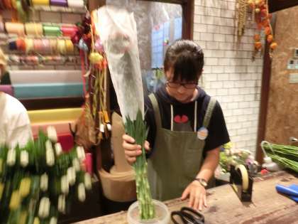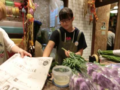 今日は簡単な花束の作成作業を行っていました。1つ1つ丁寧につくっています。この調子で頑張って下さい。